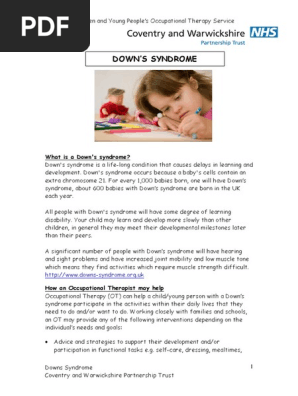Printing cutting etc Play and leisure skills. Occupational Therapy Treatment for Down Syndrome Occupational therapists OT help facilitate the development of fine motor skills. Articles that described the experience of parents of children with Down syndrome with implementing an occupational therapy home program were included in this study.