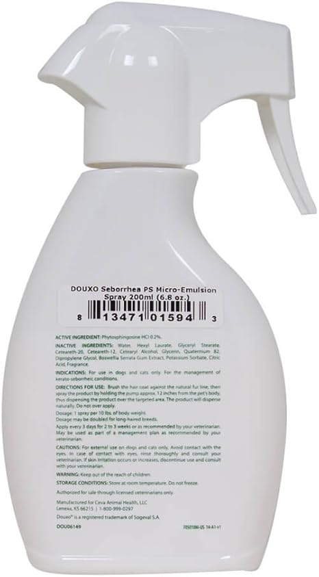 Product Description Douxo Seborrhea Micro-Emulsion Spray for Dogs and Cats topically treats seborrhea. This no-rinse formula contains sebum-regulating agents soothing and film-forming ingredients to help re-balance the skin.
