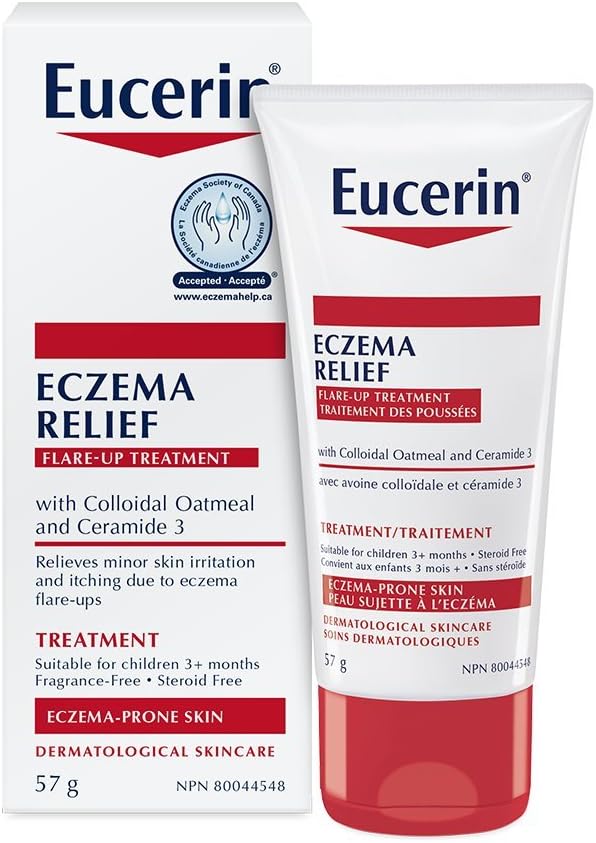 Eucerin Eczema Relief Flare-Up Treatment provides immediate relief for itching minor irritation and dryness due to eczema flare-ups. Description Eucerins Eczema Relief Flare-Up Treatment provides immediate relief for itching irritation and dryness due to eczema. Colloidal Oatmeal Skin Protectant Cream Ceramide 3 Enriched.